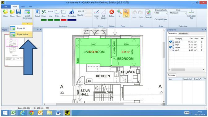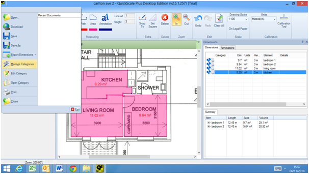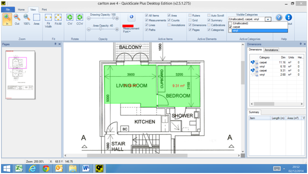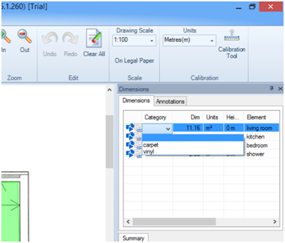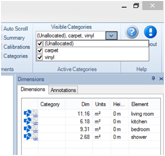 To allocate a category to an area, select the required measurement in the Dimensions pane. Under Category, click on the down arrow and select the flooring type.