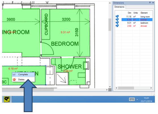 Right click on the measurement/area on the drawing and select Complete.